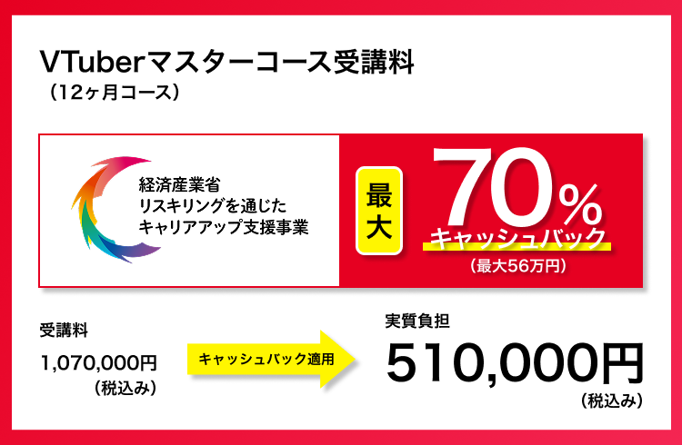本講座は経済産業省リスキリングを通じたキャリアアップ支援事業に採択決定されました。年間受講料の最大70%(一定の条件を満たした場合、年間上限56万円)のキャッシュバックが受けられます。